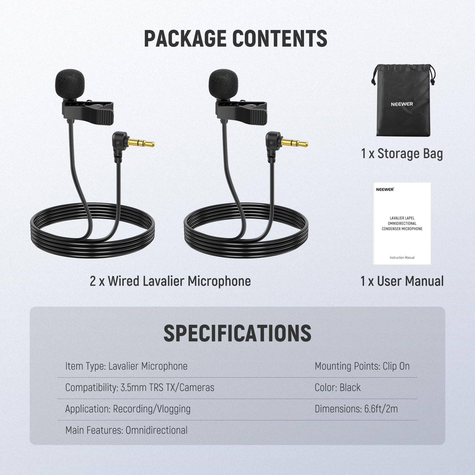 The Neewer Mini Lavalier Microphone is a compact, high-performance condenser microphone designed for seamless audio capture in various recording scenarios. Featuring a 360-degree omnidirectional pickup pattern, it delivers crisp, uncompressed sound from all directions. Constructed with durable materials, this wired lapel mic includes a 3.5mm TRS plug for broad compatibility and comes in a convenient 2-pack. Each unit measures 6.6 feet (2 meters) in length, providing ample reach for flexible placement during use.